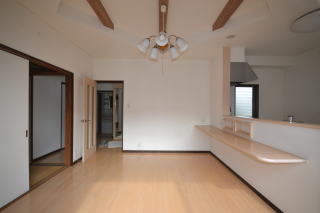 LDK11帖。対面式のキッチンは上部に棚がなく、開放的な造りに。お隣の和室とは続き間で、広々と使えます。