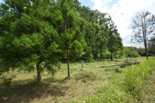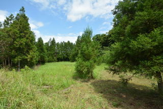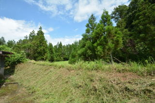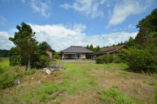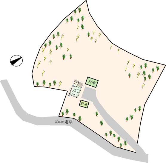敷地中央に母屋と倉庫があり、外側に山林があります。