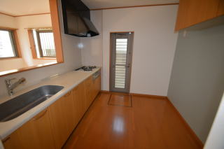 キッチン。 上部に棚がなく、すっきりしていて使いやすい。