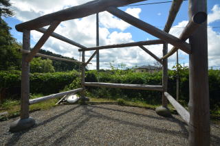 南側の端に、大丸太組みの骨組みにハンモックなどを吊るして楽しめるよ!