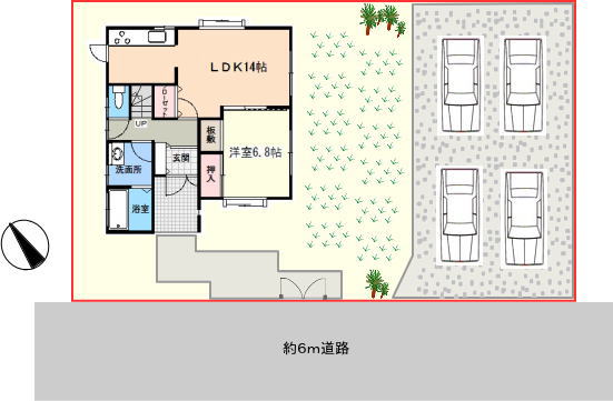 南東側には車4台分の、砂利敷きの駐車スペースがあります。間口も広く停めやすいですよ。