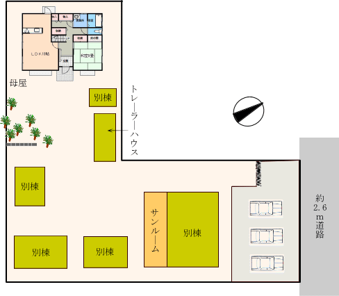 約300坪の広い敷地に建つ、母屋+別棟+トレーラーハウス付きの物件です。