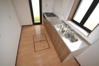 キッチンは奥にあり、リビングからは見えにくい造りになっています。勝手口付きで、使い勝手も良さそうです。