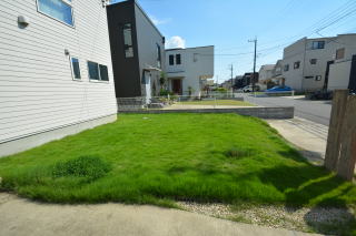 西側お庭。芝生が敷かれているのみで、これからお庭造りが楽しめそうです。