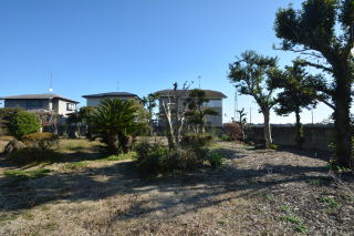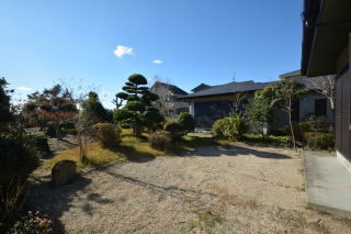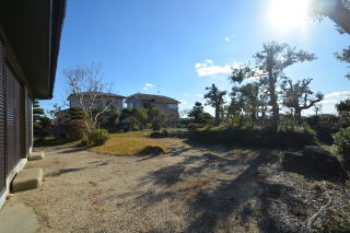 建物を背にお庭を見る