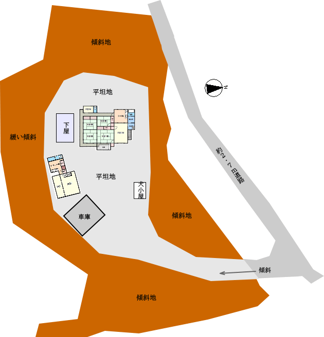 敷地は広く舗装され、離れや、車庫などが点在しています。