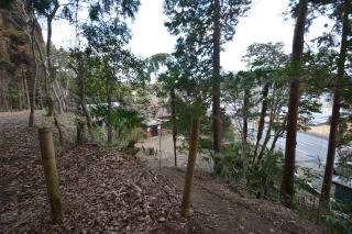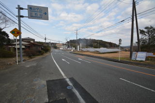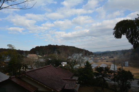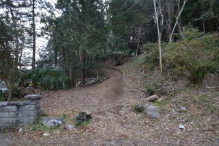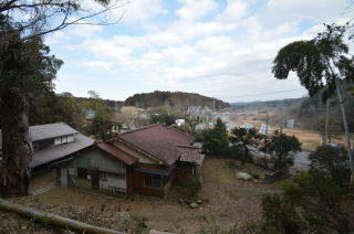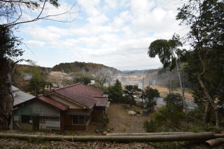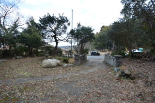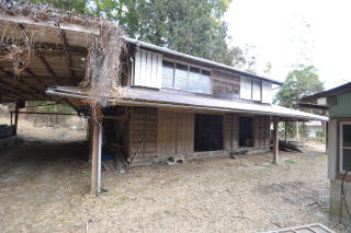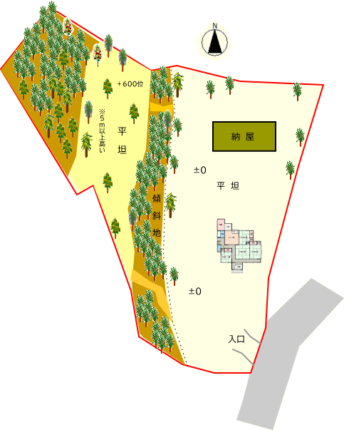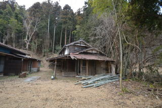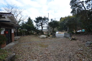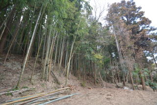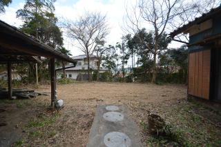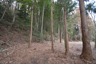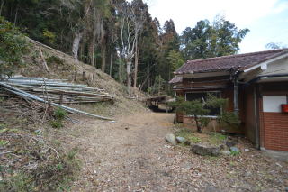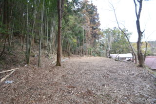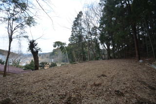 下の平坦地から見る。敷地西側には山林が広がっています。