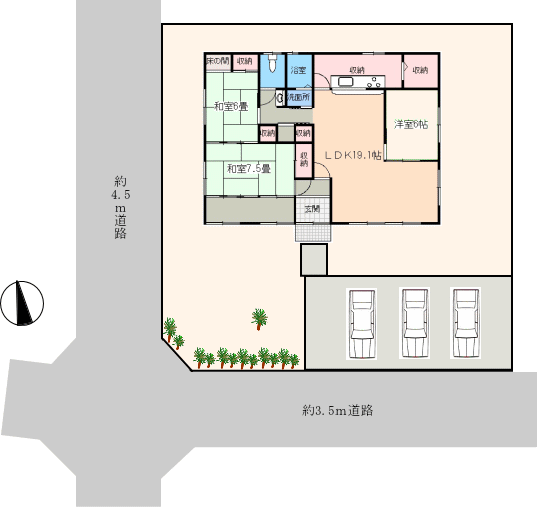 駐車スペースは車3台分。間口が広く並列で停められて便利です。