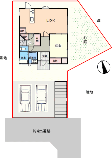南西・約4m道路。ビッグ・エーまで約650m、ドン・キホーテまで約2.3kmで、生活は便利です。