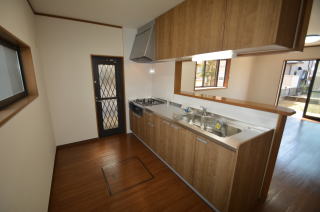 キッチンは対面式で、リビングの様子が見渡せます。勝手口もあり、使い勝手も良さそうですよ。