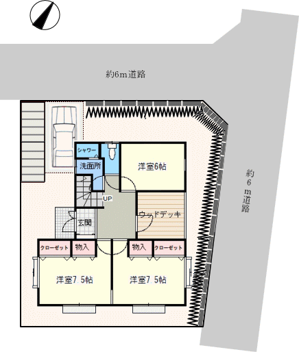北西・約6m道路。スーパーせんどうまで徒歩約6分。イトーヨーカドーまで徒歩約18分で、生活は便利です。
