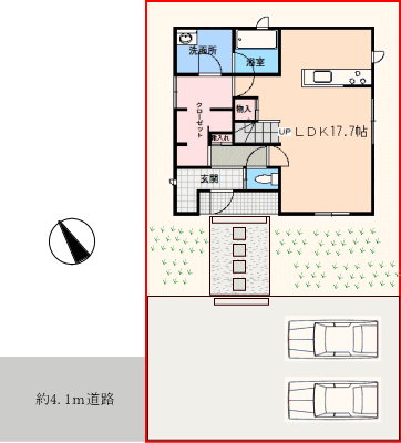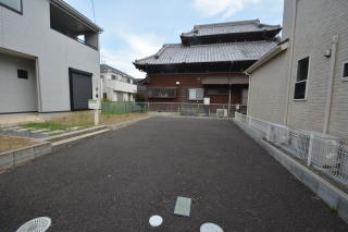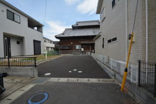 駐車スペースは広く舗装され、車は並列で停められて便利です。北西側には、幅約4mの前面道路。