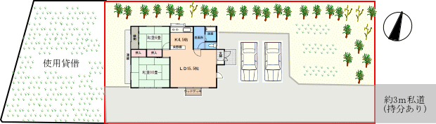 敷地は、東西に長く広がっています。※建物手前部分のお庭は使用貸借です。
