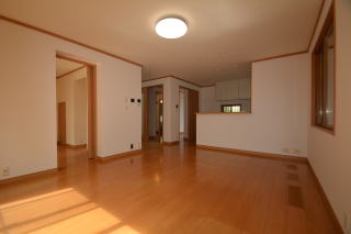 逆方向から。キッチン上部の棚がなく、すっきりしたリビングです。