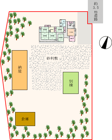 広い敷地には、別棟や納屋などが点在しています。