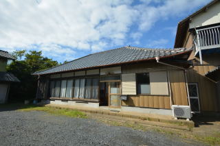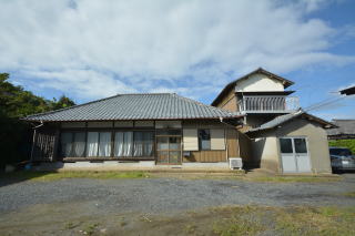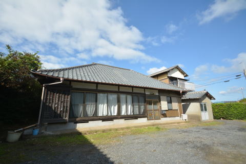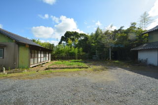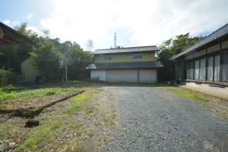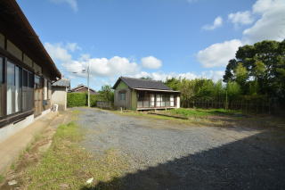 西側から母屋前。広く砂利が敷かれ、駐車スペースとして利用出来ます。