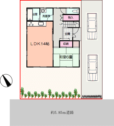 南西・約5.85m道路。サンドラッグまで徒歩約7分、ランドロームフードマーケットまで徒歩約13分で、生活便利。