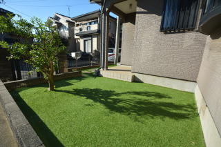 お庭は人工芝が敷かれ、綺麗にお手入れされています。お好みのお庭にアレンジしてもいいですね。